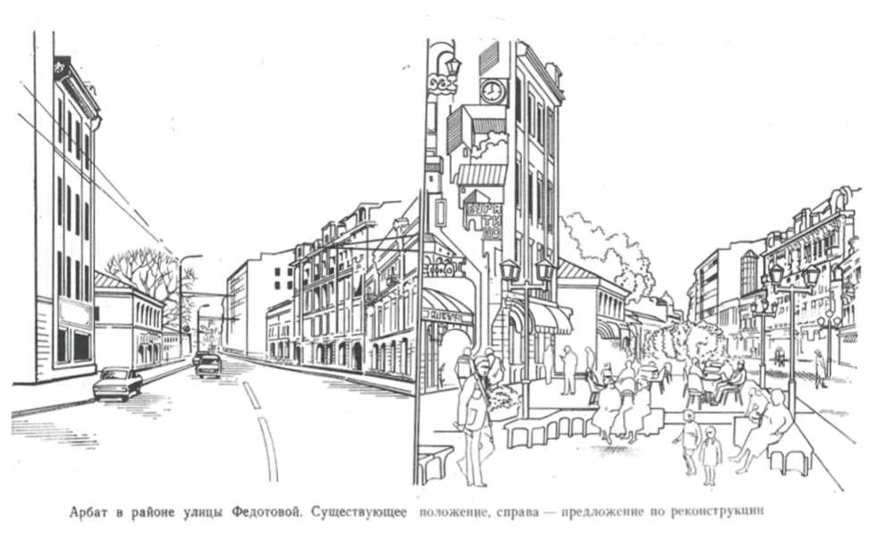 Не все эти меры были соблюдены. На Арбате появились кирпичные и панельные дома, повышение высотности застройки повлияло на сложившуюся морфологию участка. Удалось же осуществить лишь поддерживающий ремонт зданий, расчистить дворы, реализовать благоустройство и озеленение, снести малоценные, случайные и ветхие строения, поработать с внешним оформлением, рекламой, освещением.