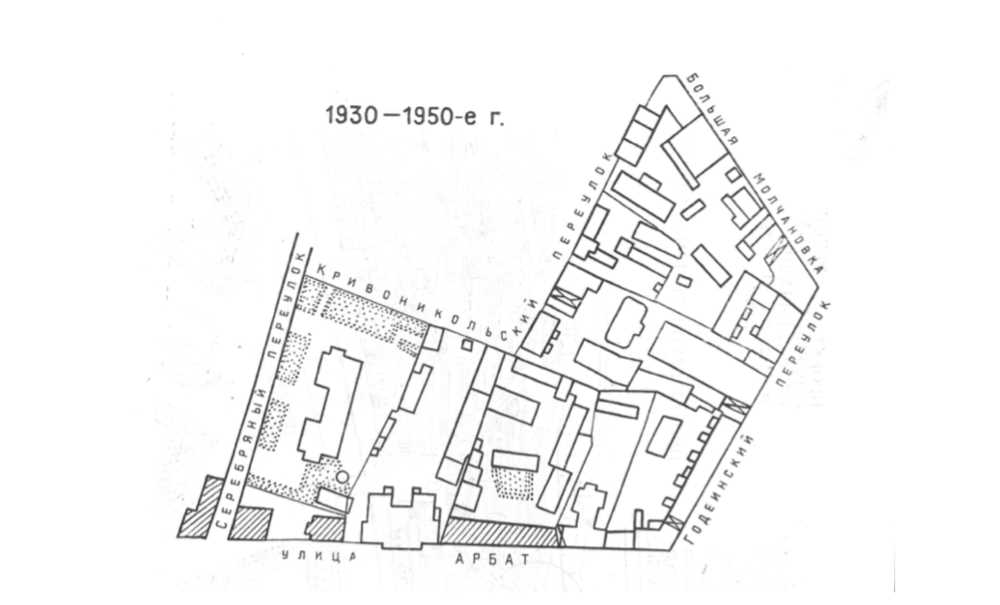 К началу XX в. улица Арбат стала оживлённой торговой улицей с нарядными витринами и броскими рекламами. По Генплану 1935 года улица в восточной части города сохранялась для дальнейшей реконструкции, а параллельно ей пробивалась новая Ново-Арбатская магистраль. Реализация этой магистрали повлекла за собой полный снос исторической застройки.