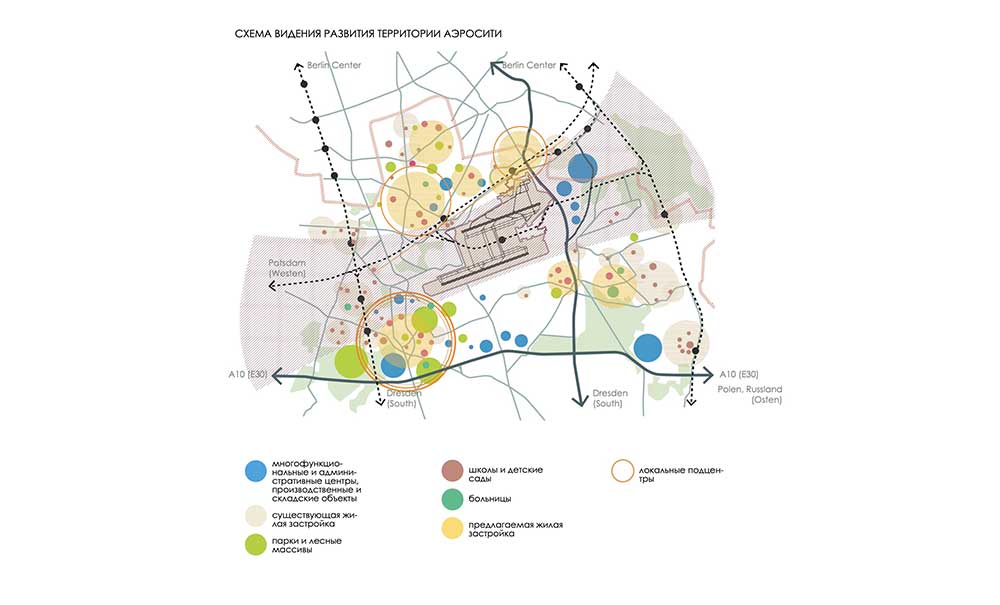 Эта территория обладает удобной транспортной доступностью до центра Берлина, высоким рекреационным потенциалом, а также достаточным количеством земель для новой застройки. Мы предложили разделить Аэро-сити на три подцентра.