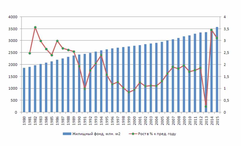Жилой фонд страны в 1980–2016 годах показывает достаточно равномерный рост в пределах 2,5–3,5% ежегодно, в период с 1981 по 1989 год. Затем нестабильный период с разбросом прироста к предыдущему году в пределах 1–2,5%.
